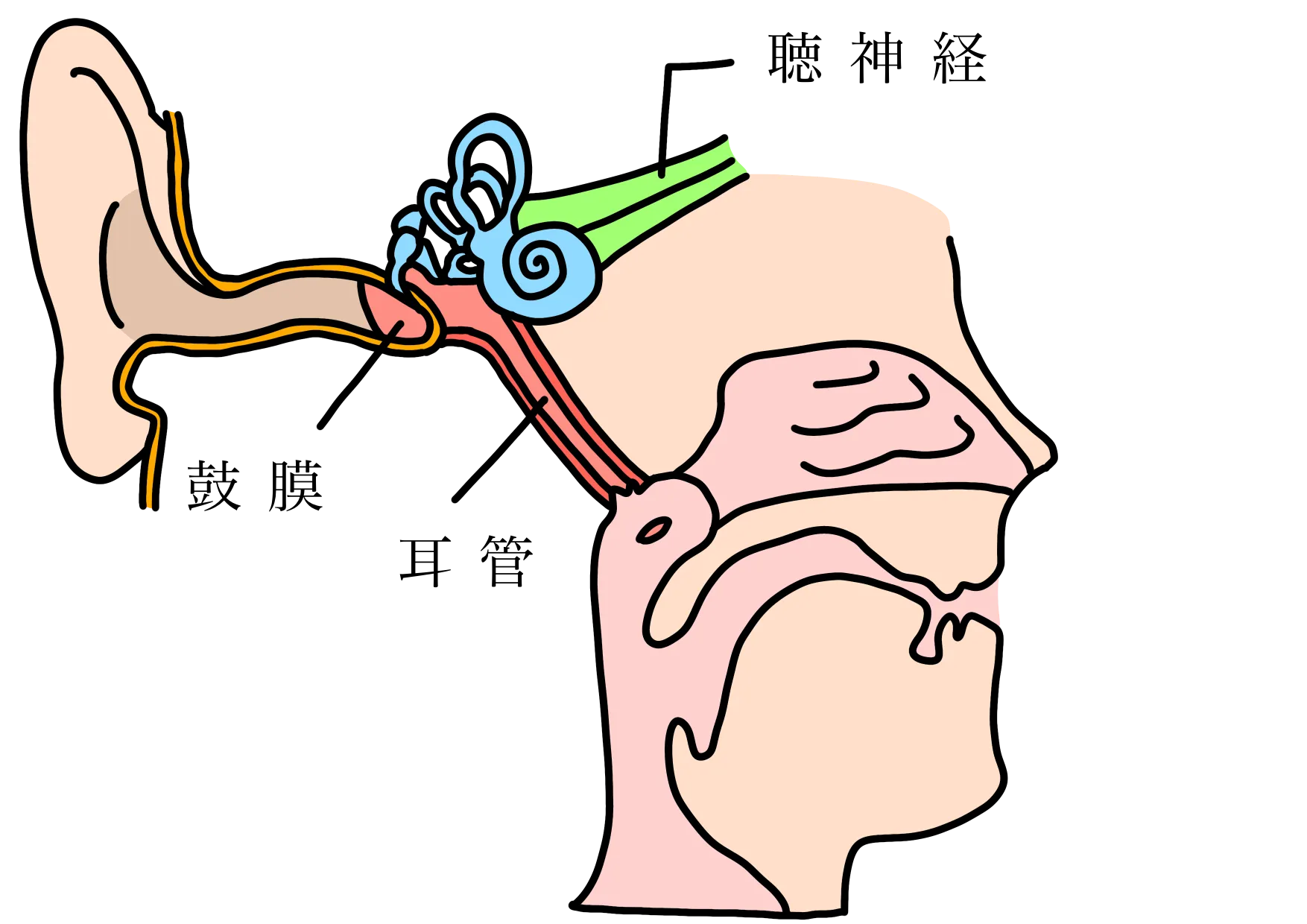 耳管とは、のどの奥と「中耳(鼓膜の内側にある空間)」をつなぐ細い管のことです。